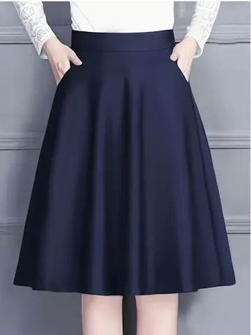 Navy Blue Women’s Midi A-Line Skirt – High-Waisted with Pockets | Solid Color, Non-Stretch Material, Perfect for Office or Casual Outfits, Spring/Summer Essential